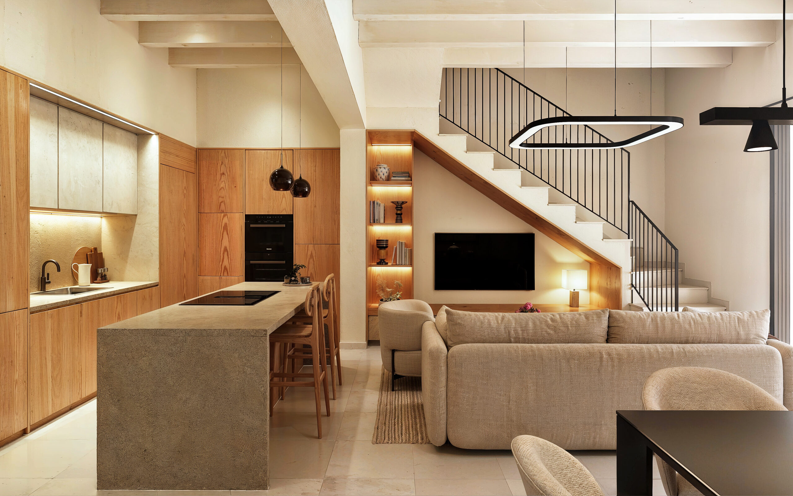 El acceso principal se abre a un espacio continuo de “open concept” donde el salón–comedor y la moderna cocina abierta conviven en perfecta armonía. La amplitud visual, la entrada de luz natural y las líneas limpias contribuyen a una atmósfera cálida y actual, ideal tanto para el día a día como para recibir invitados. En esta misma planta baja se ha previsto un aseo de cortesía, muy práctico para preservar la privacidad de la zona de noche en la planta superior. Desde el área social, grandes aperturas conectan directamente con el patio, creando un diálogo constante entre interior y exterior.
