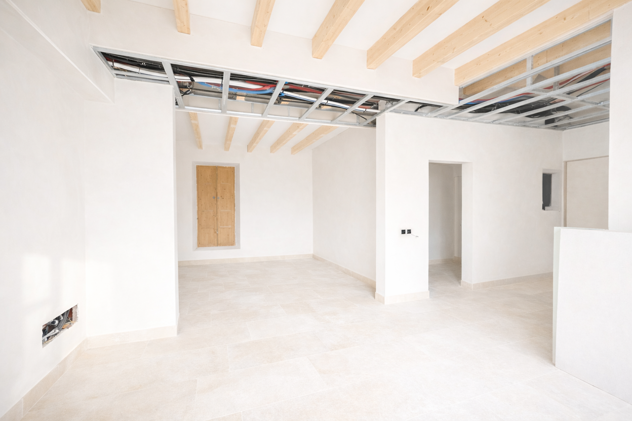 Desde el primer paso en su interior, la casa transmite una sensación de paz y armonía. El proyecto de reforma ha apostado por una estética minimalista pero cálida, utilizando una paleta de colores neutros y materiales nobles. Los suelos de piedra natural en tonos claros unifican los espacios, aportando luminosidad y frescura. Los techos altos, con sus impresionantes vigas de madera vista restauradas y dejadas en su tono natural, añaden carácter y recuerdan el origen tradicional de la vivienda, creando un contraste precioso con las líneas depuradas de las paredes blancas.