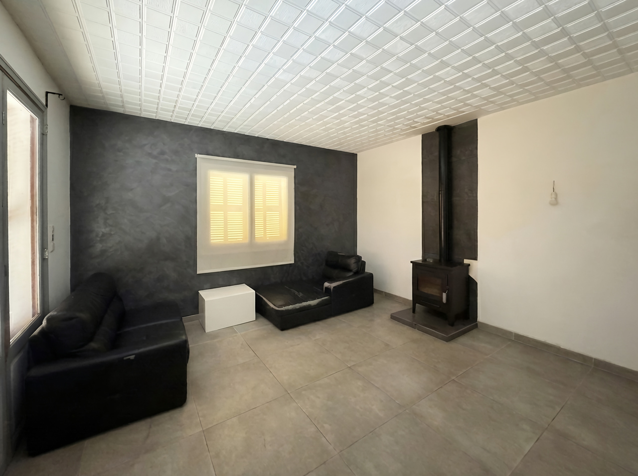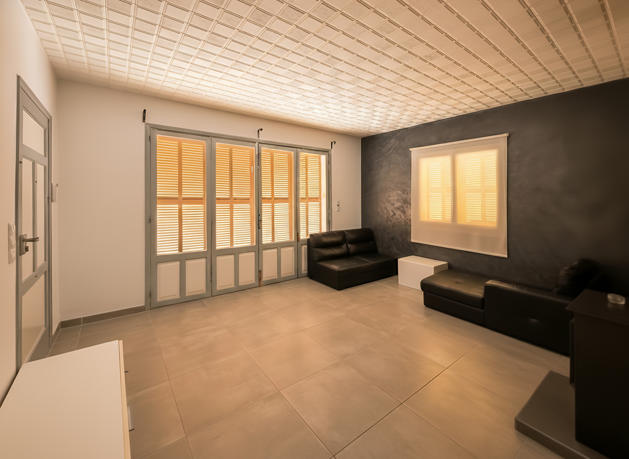 La vivienda se distribuye en una única planta, lo que garantiza una accesibilidad total y una circulación fluida entre estancias. El corazón de la casa es su gran salón-comedor, un espacio que huye de lo convencional. Destaca el tratamiento de sus paredes con un acabado texturizado en gris que aporta un toque contemporáneo y sofisticado, contrastando con la calidez de la chimenea de leña situada en la esquina, perfecta para climatizar el hogar y crear ambiente en los meses de invierno. La luz natural inunda la estancia a través de unos grandes ventanales con puertas abatibles y persianas mallorquinas de madera, que conectan directamente con el porche delantero.