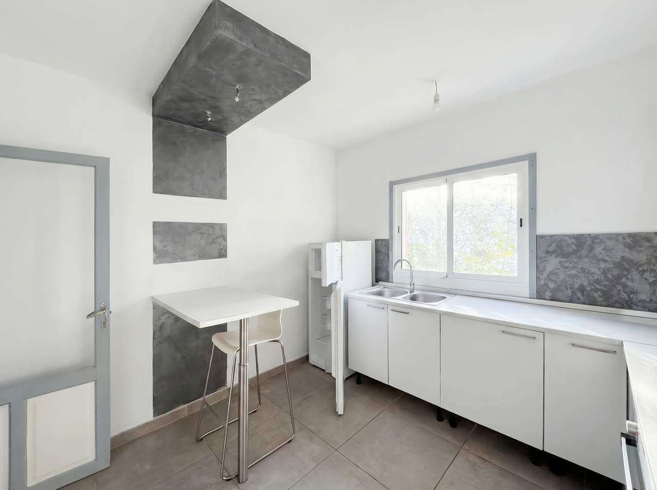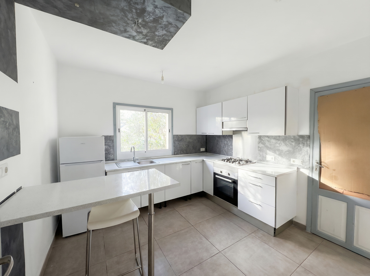 La cocina independiente es otro de los puntos fuertes. Ha sido renovada con un estilo moderno y funcional, presentando líneas rectas en blanco brillante que potencian la luminosidad. Cuenta con una práctica barra de desayuno en península, ideal para el café de la mañana, y está equipada con electrodomésticos de acero inoxidable (horno, encimera de gas y campana decorativa). Su diseño en «L» optimiza el espacio de trabajo y ofrece abundante almacenamiento, manteniendo una estética limpia y actual.