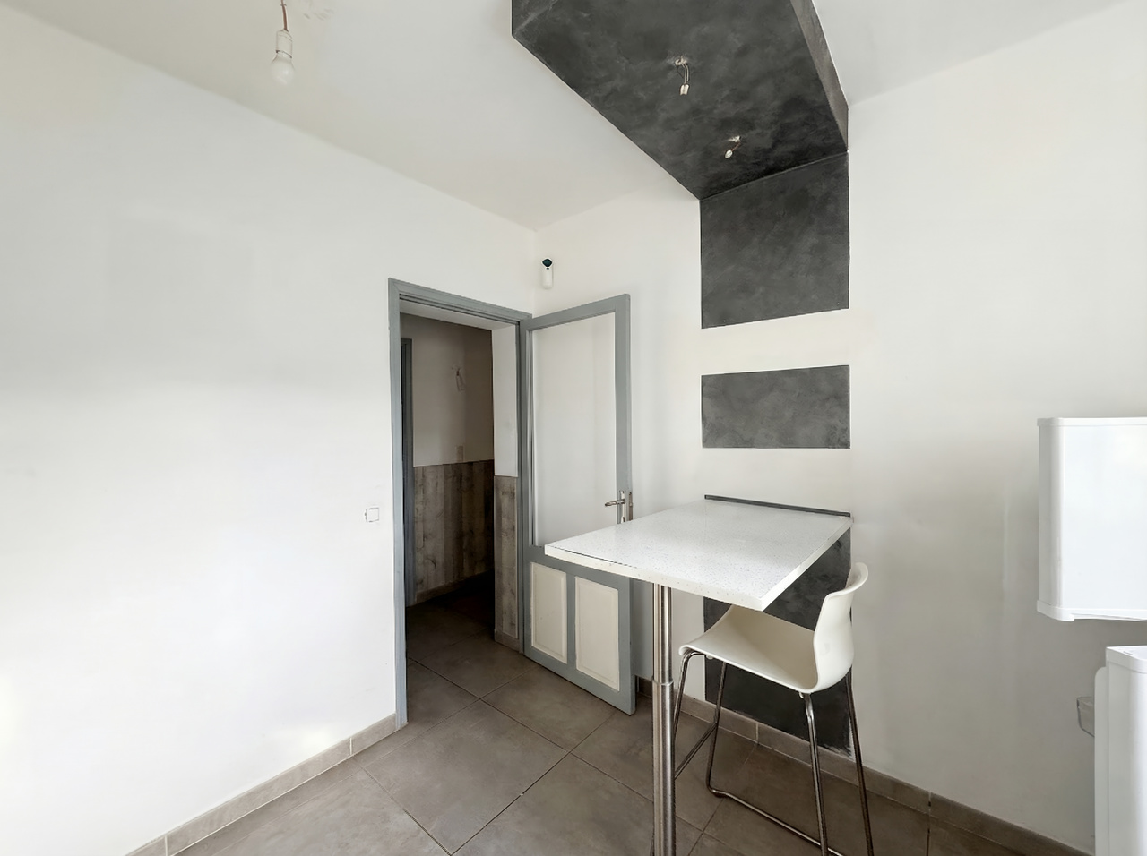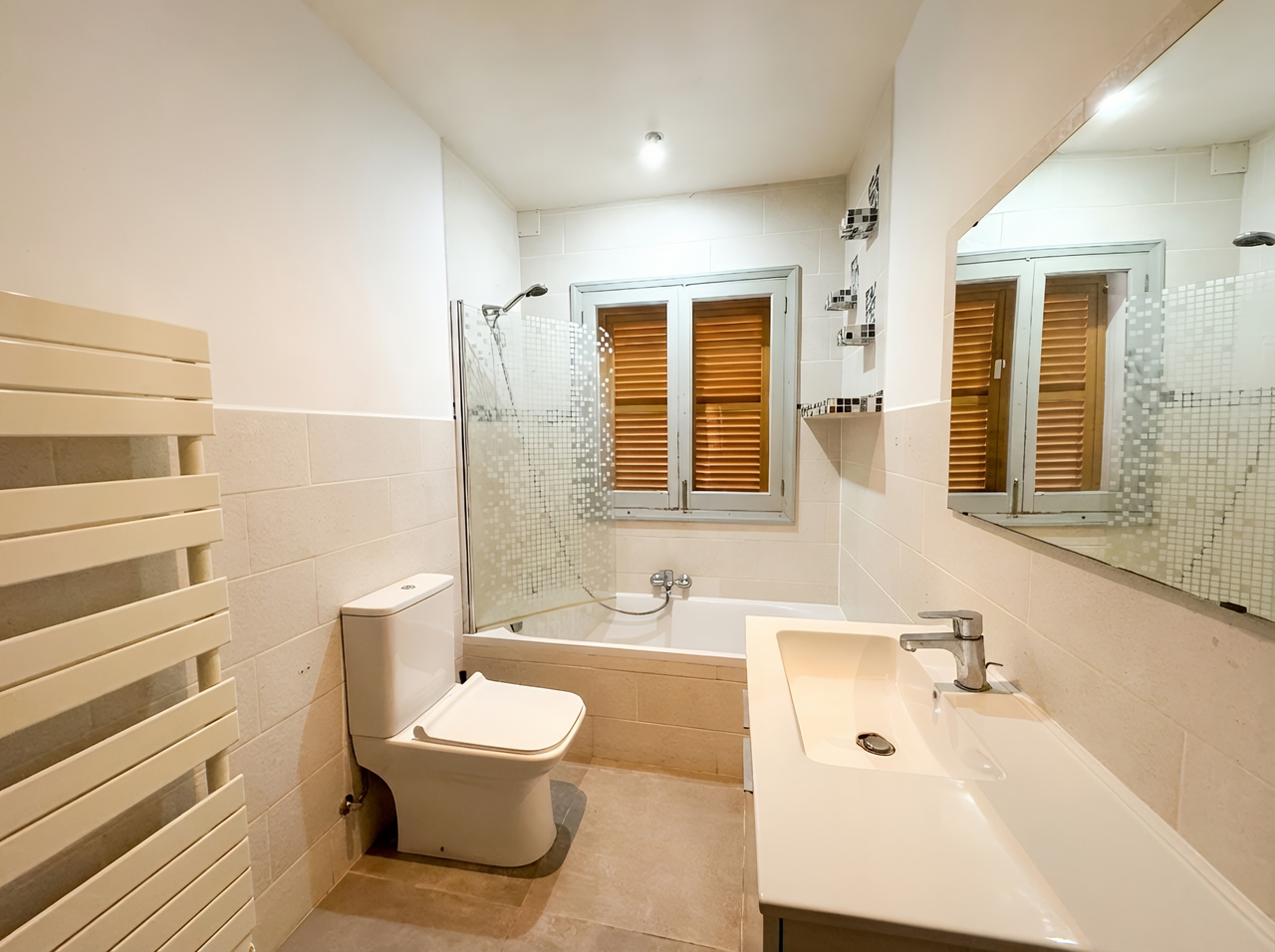 Para dar servicio a la vivienda, contamos con un cuarto de baño completo de generosas dimensiones. Está equipado con una bañera con mampara de cristal, un amplio mueble de lavabo que ofrece buen almacenamiento, inodoro, bidé y un radiador toallero, un detalle de confort muy agradecido en invierno. Los revestimientos en tonos arena crean una atmósfera neutra y relajante.