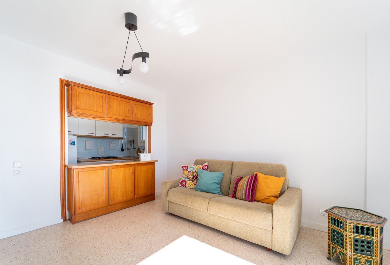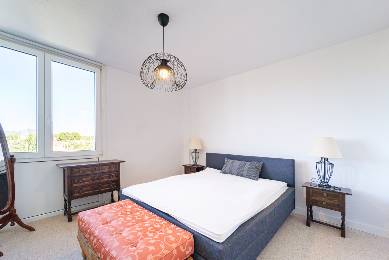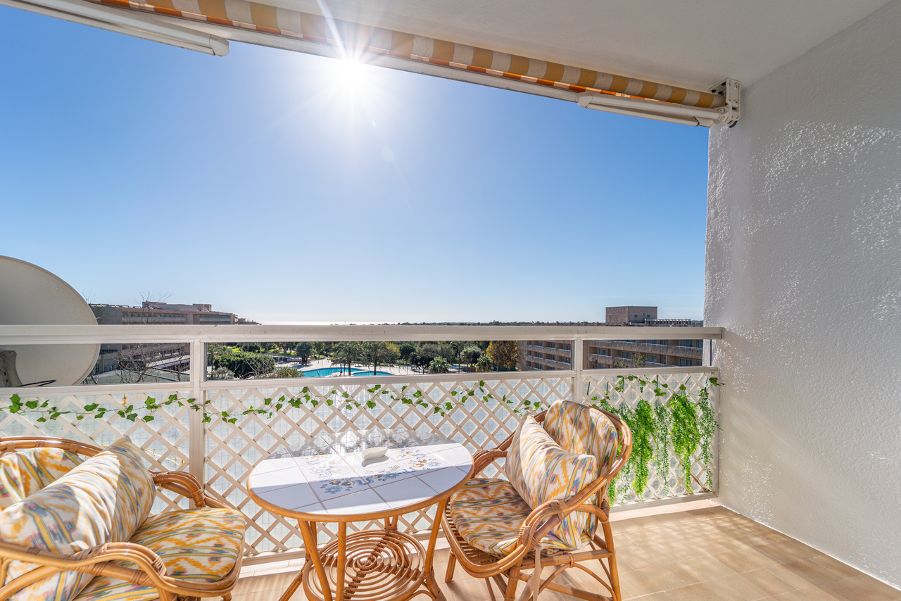 Uno de los grandes valores de este apartamento en alquiler en Calas de Mallorca es, sin duda, su terraza con vistas al mar. La altura de la quinta planta, combinada con el entorno abierto de la zona, permite disfrutar de un horizonte azul que cambia con la luz del día. Desde primeras horas de la mañana hasta el atardecer, el Mediterráneo se convierte en el telón de fondo perfecto para desconectar y ganar calidad de vida sin salir de casa.