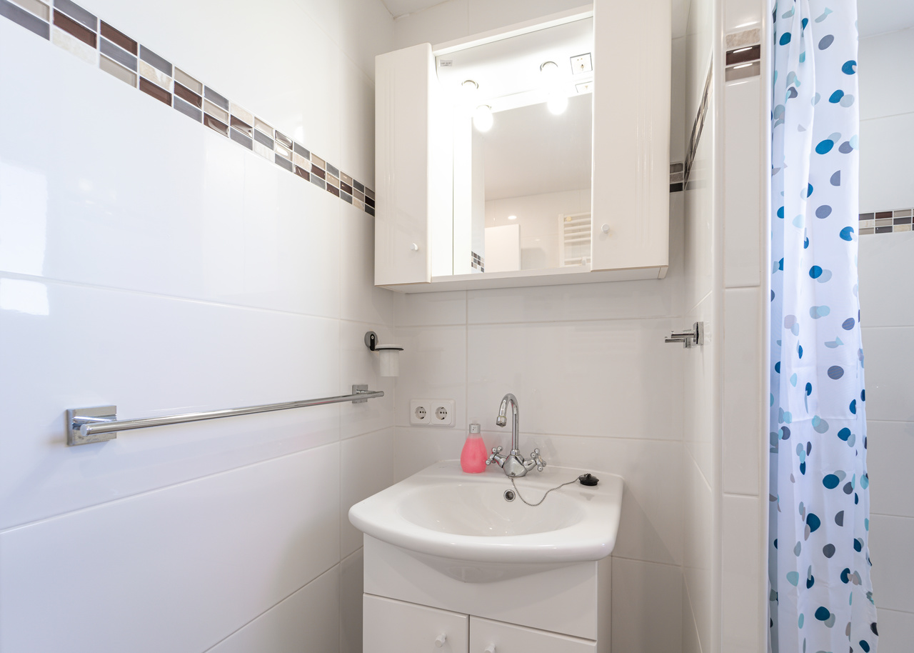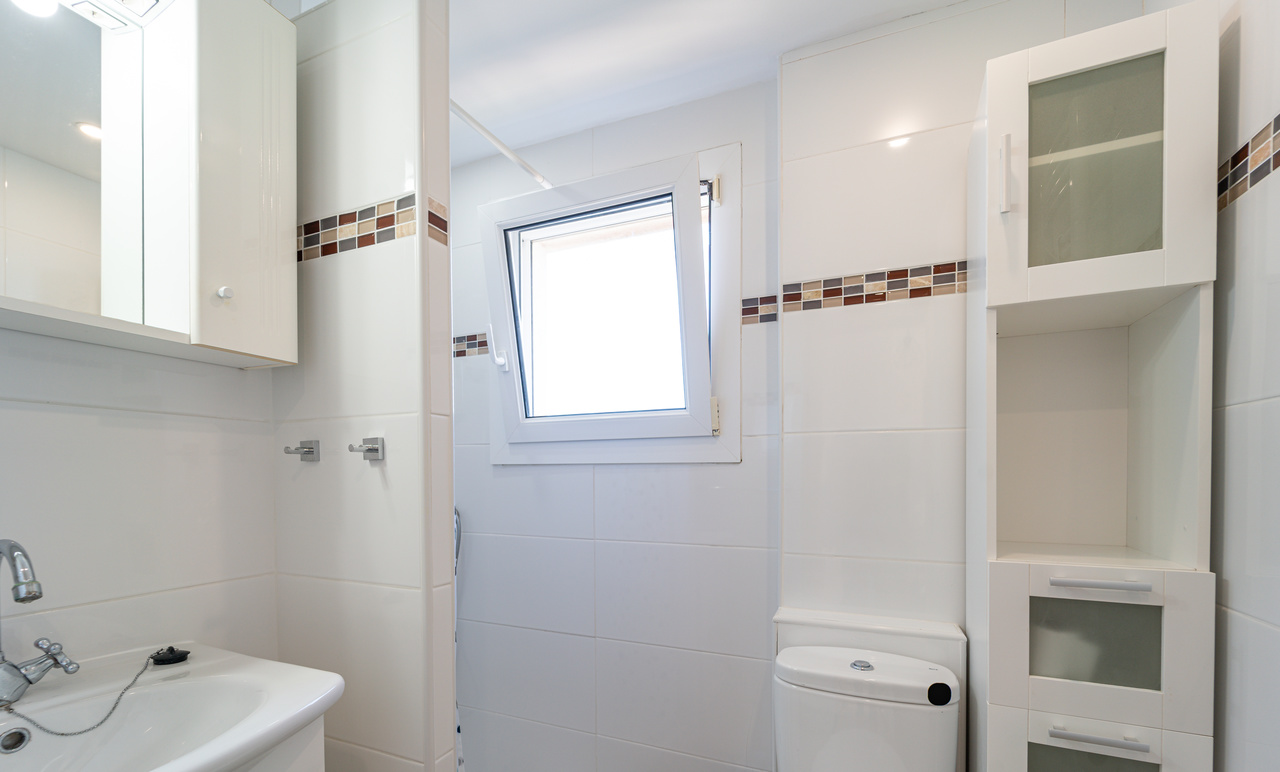 El dormitorio ofrece un ambiente tranquilo para el descanso. Gracias a la altura de la planta y a la orientación del conjunto, la vivienda disfruta de buena luz y ventilación cruzada, elementos clave para mantener una temperatura agradable durante gran parte del año. El cuarto de baño, de diseño sencillo y cómodo, completa la distribución con todo lo necesario para el uso diario.
