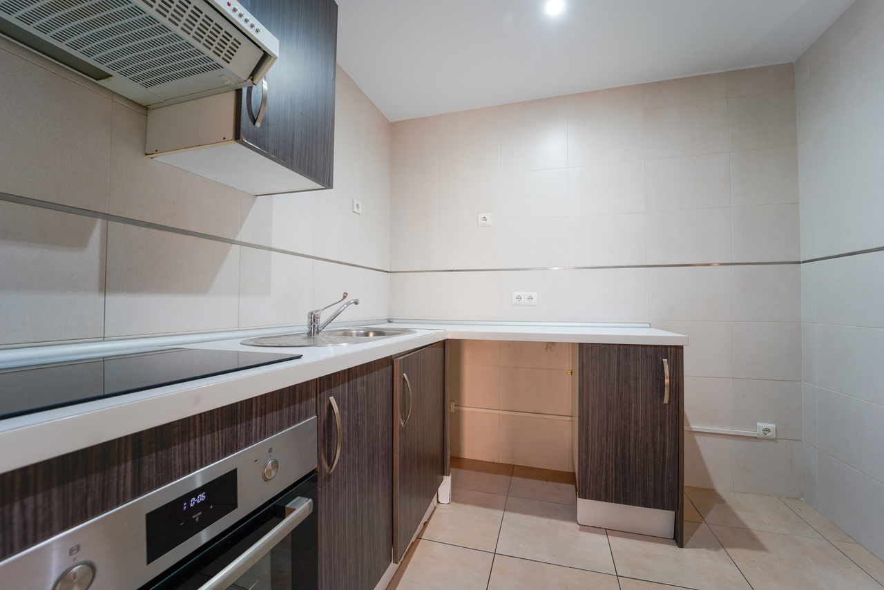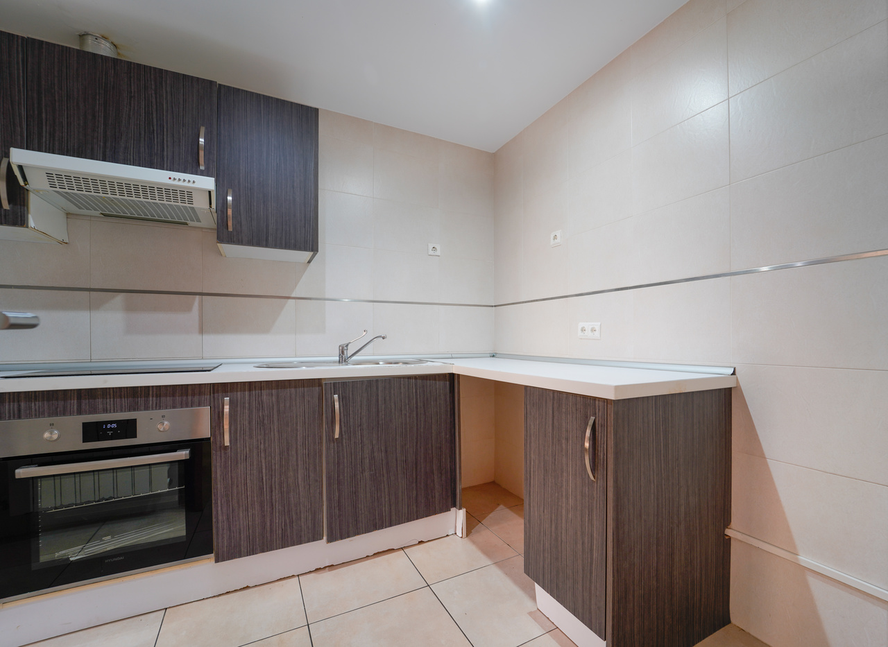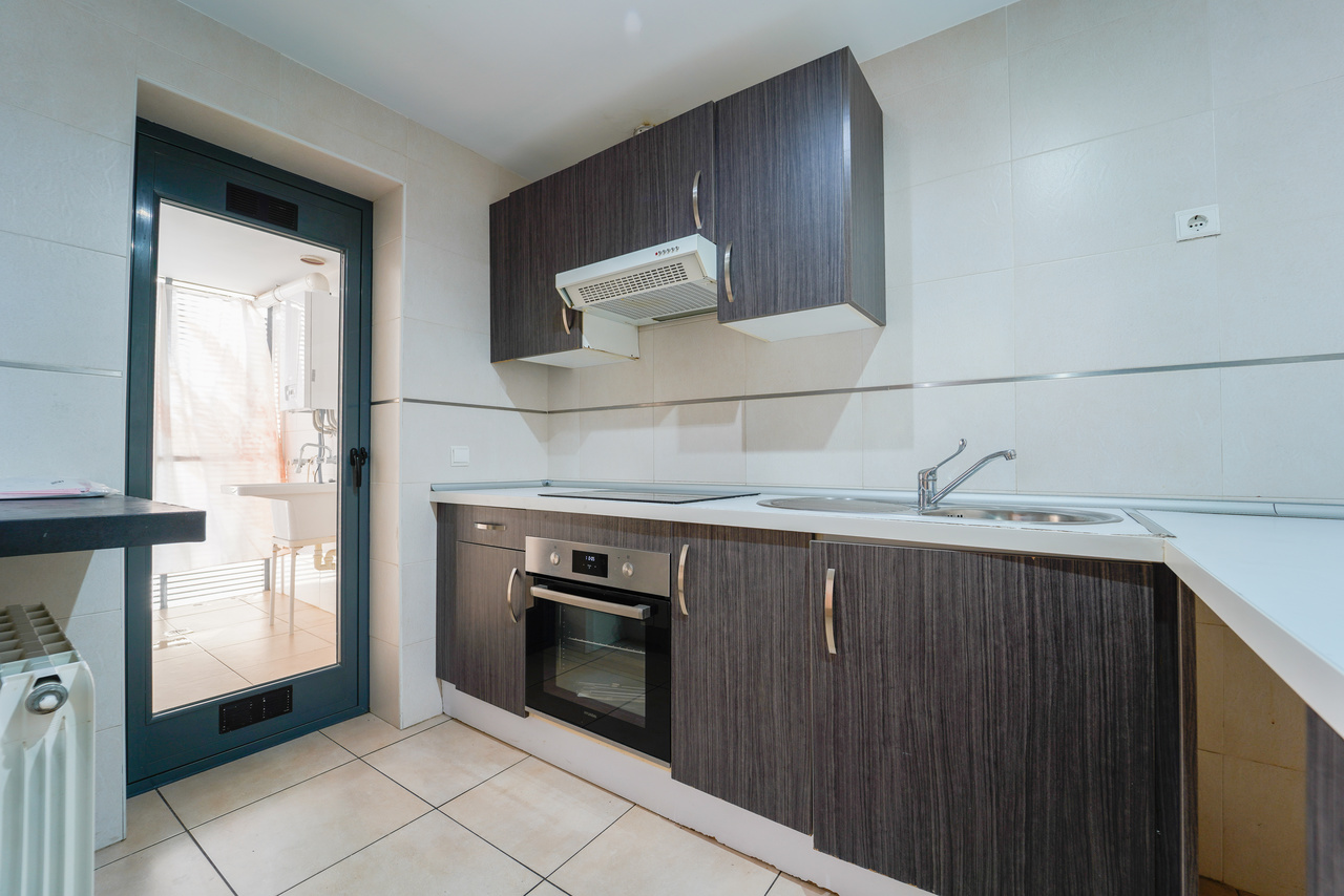 La zona culinaria de la vivienda está compuesta por una cocina independiente de diseño funcional y acabados de gran durabilidad. Equipada con elegantes armarios en tonos de madera oscura que contrastan armónicamente con las encimeras claras y los suelos de gres, esta estancia ofrece una generosa capacidad de almacenaje y un entorno de trabajo cómodo para el día a día. Uno de los elementos más prácticos y valorados de esta propiedad es su acceso directo desde la cocina a una útil coladuría o zona de lavadero independiente. Este espacio anexo, que cuenta con ventilación exterior, resulta fundamental para gestionar las tareas domésticas, ubicar los equipos de lavado y almacenar los productos de limpieza, manteniendo así el orden y la estética impecable en el resto de la casa.