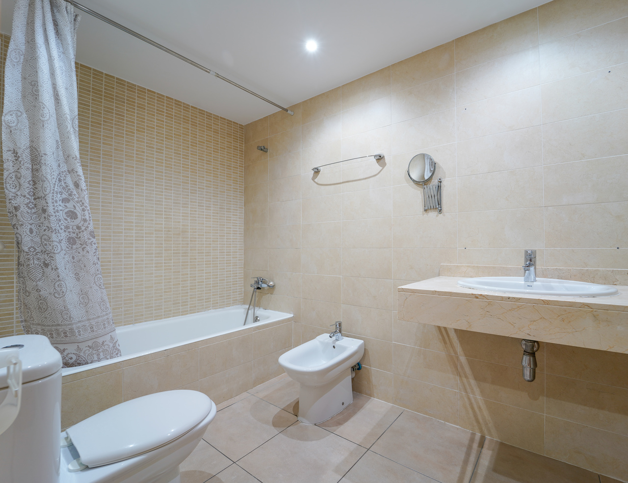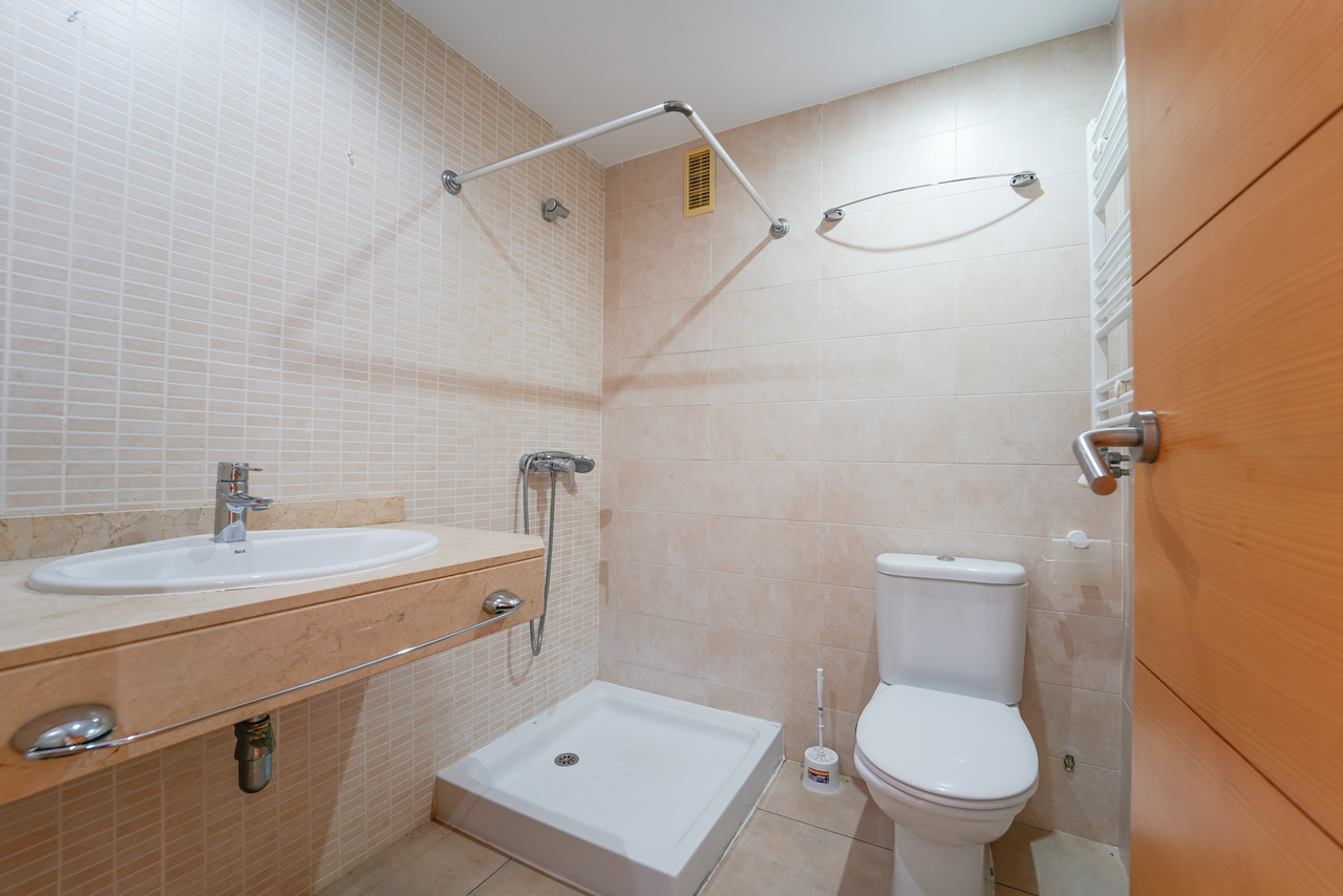 El área de descanso ha sido diseñada pensando en la máxima privacidad y comodidad. El piso dispone de dos luminosas habitaciones, ambas con orientación exterior, que continúan con la línea de confort que define a toda la propiedad. Estos dormitorios están inteligentemente equipados con armarios empotrados de madera, optimizando al máximo el espacio disponible y facilitando una organización impecable del vestuario. Para dar servicio a estas habitaciones y a las posibles visitas, la vivienda cuenta con dos cuartos de baño completos. Uno de ellos dispone de una cómoda bañera, ideal para disfrutar de momentos de relajación tras una larga jornada, mientras que los acabados cerámicos en tonos neutros de ambos baños aportan un toque de limpieza visual y atemporalidad al conjunto.