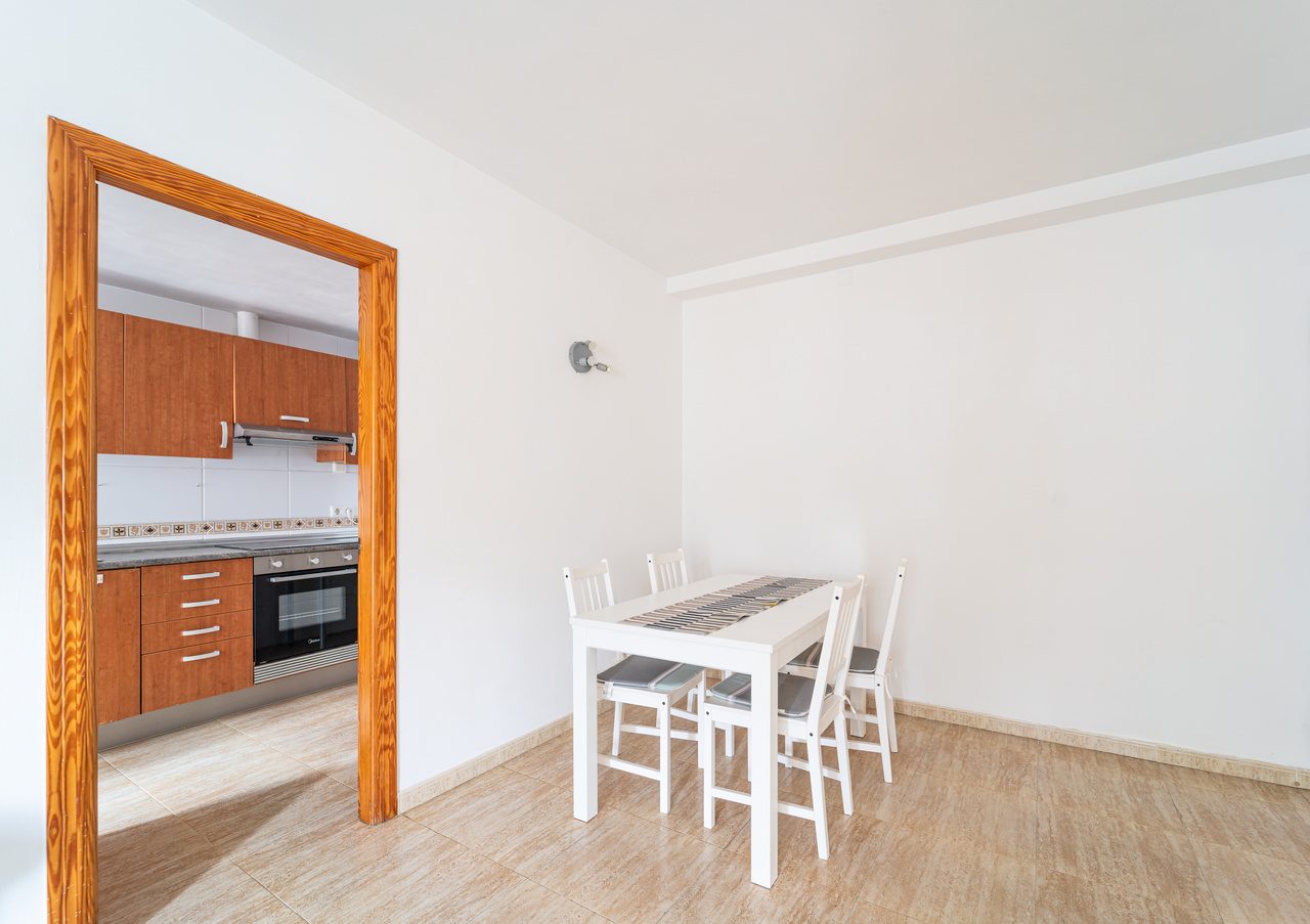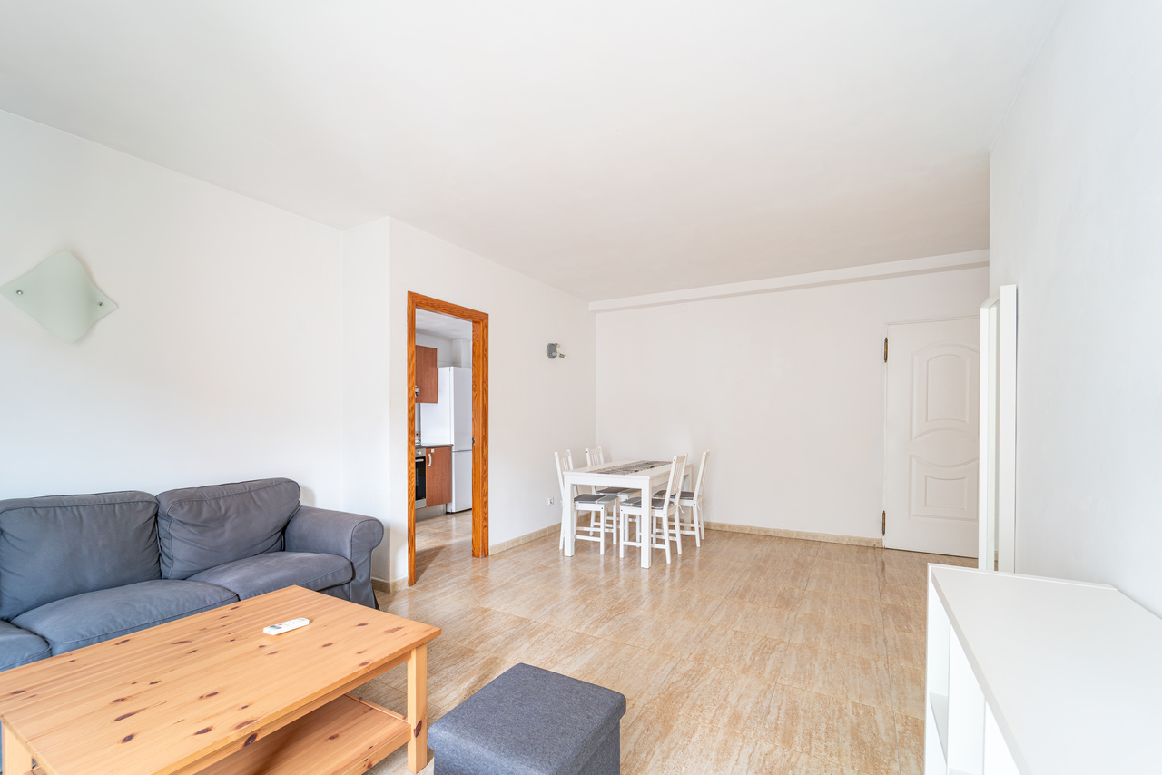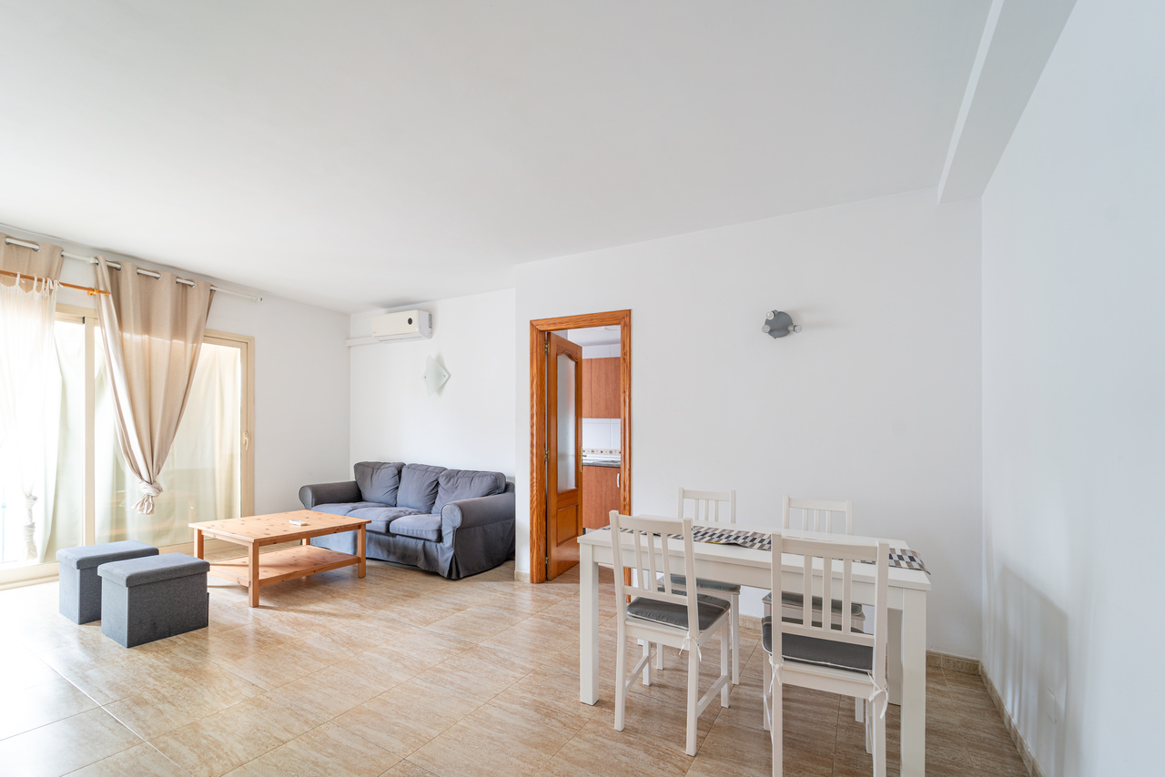 La distribución está pensada para el día a día. El corazón de la vivienda es el salón comedor, un espacio cómodo para la convivencia que, además, cuenta con aire acondicionado (frío/calor) para disfrutar de una temperatura agradable en cualquier estación. Desde aquí se accede al balcón, ideal para ventilar, desayunar al aire libre o simplemente tomar el sol suave de la mañana. Este desahogo exterior aporta amplitud y una conexión directa con el ambiente mediterráneo de Campos.